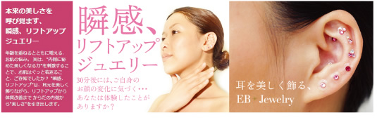 くすみやたるみ、乾燥など、年齢と共に増加するお肌の悩み。多くの人に共通する老化や肌 トラブルですが、残念ながら表面的なアプローチだけでは根本的な解決にはなりません。 EBTAの「瞬感、リフトアップ」は、美しく耳を飾りながらツボを刺激し、リフトアップか ら体質改善まで、身体の内側から「美しくなる力」を呼び覚まします。 |